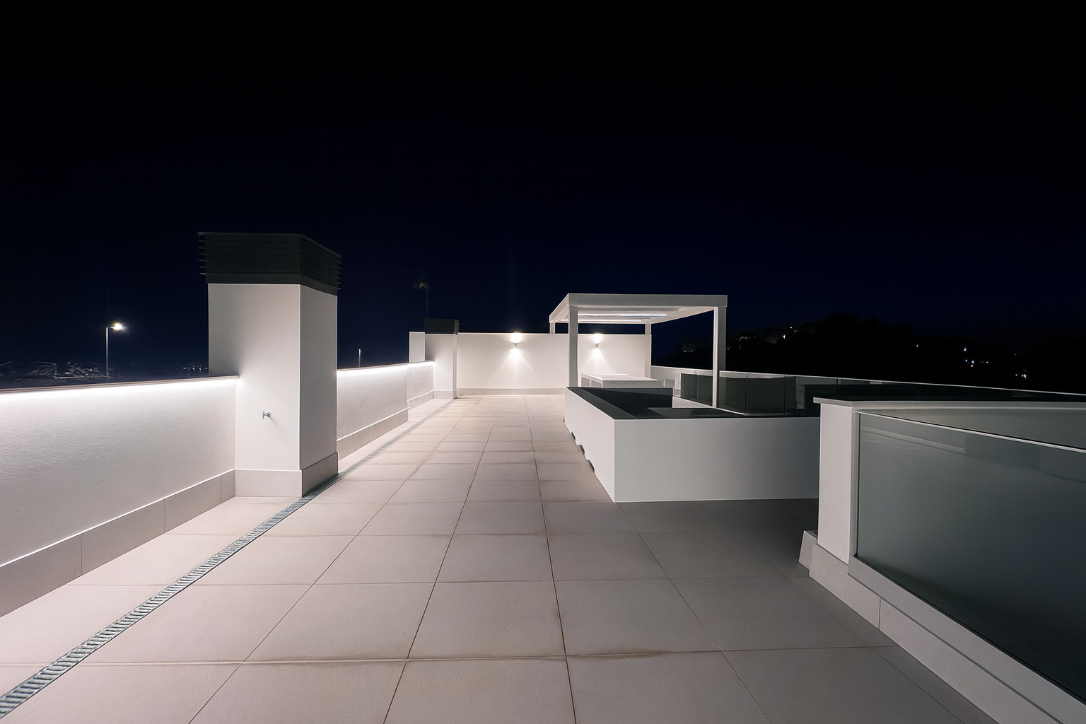 La planta superior ofrece una segunda terraza de 127 m² con zona de comedor exterior y un elegante espacio de estar, ideal para disfrutar de las tardes con impresionantes vistas panorámicas a las colinas de La Quinta. La iluminación perimetral LED crea una atmósfera cálida y acogedora.