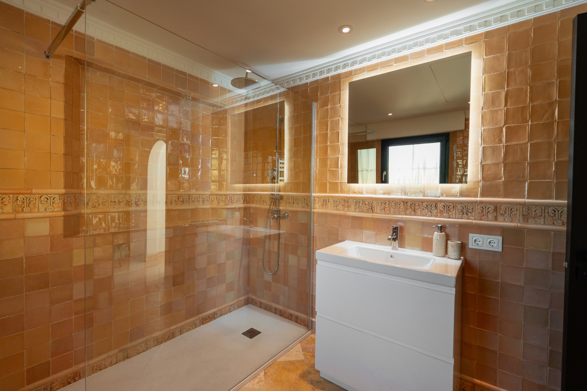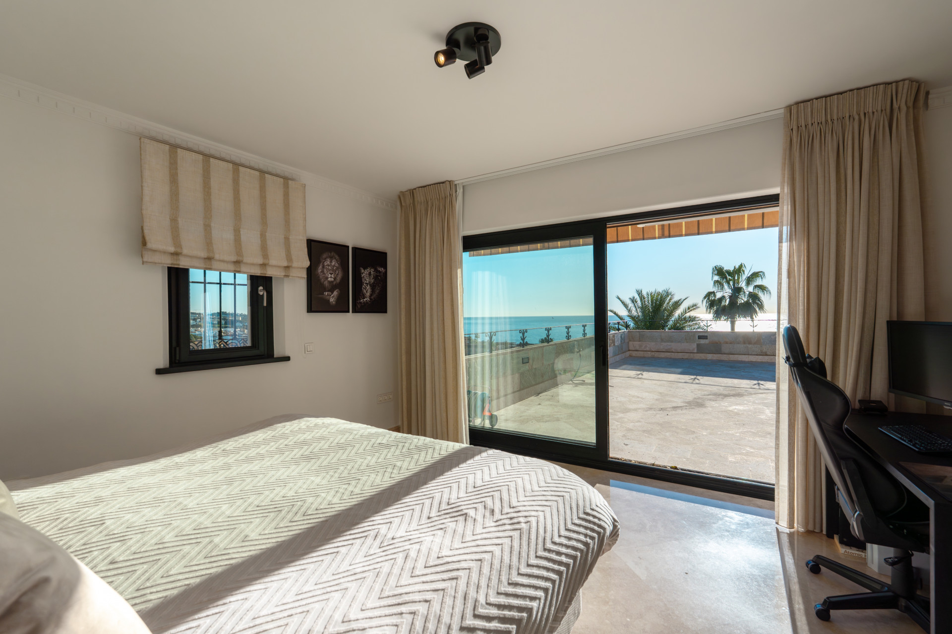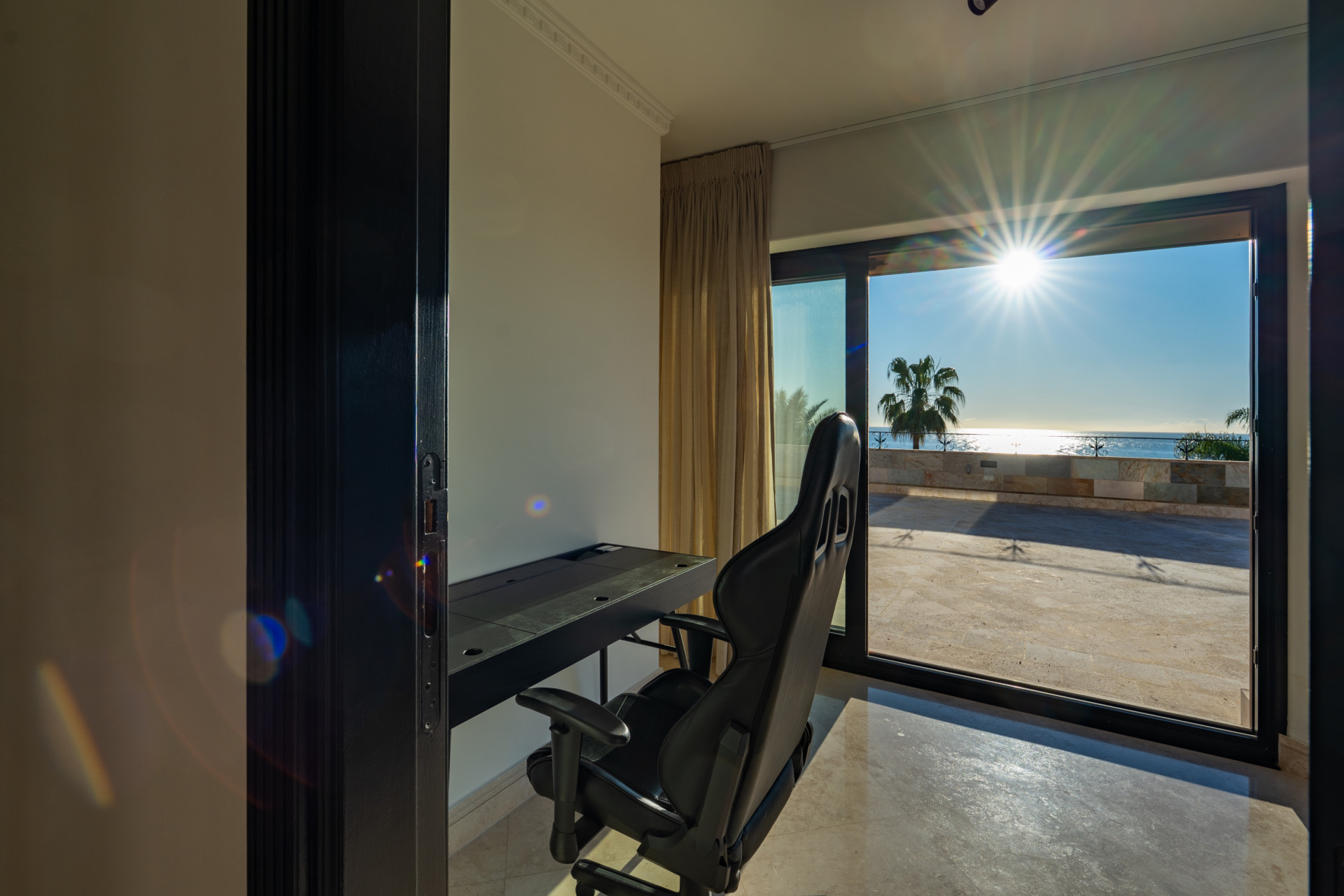 La planta superior alberga dos dormitorios adicionales, ambos con baño en suite, vistas al mar y acceso directo a una amplia terraza solárium. Un espacio de oficina independiente completa esta planta, perfecto para trabajar desde casa.