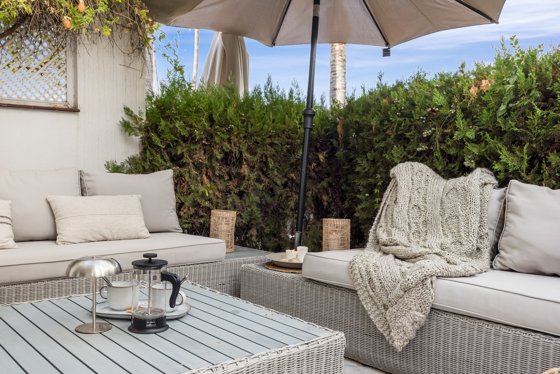 El salón cuenta con un cómodo sofá y sillones, y se abre a la encantadora terraza donde podrá disfrutar de una cena o una copa con sus amigos o familiares.