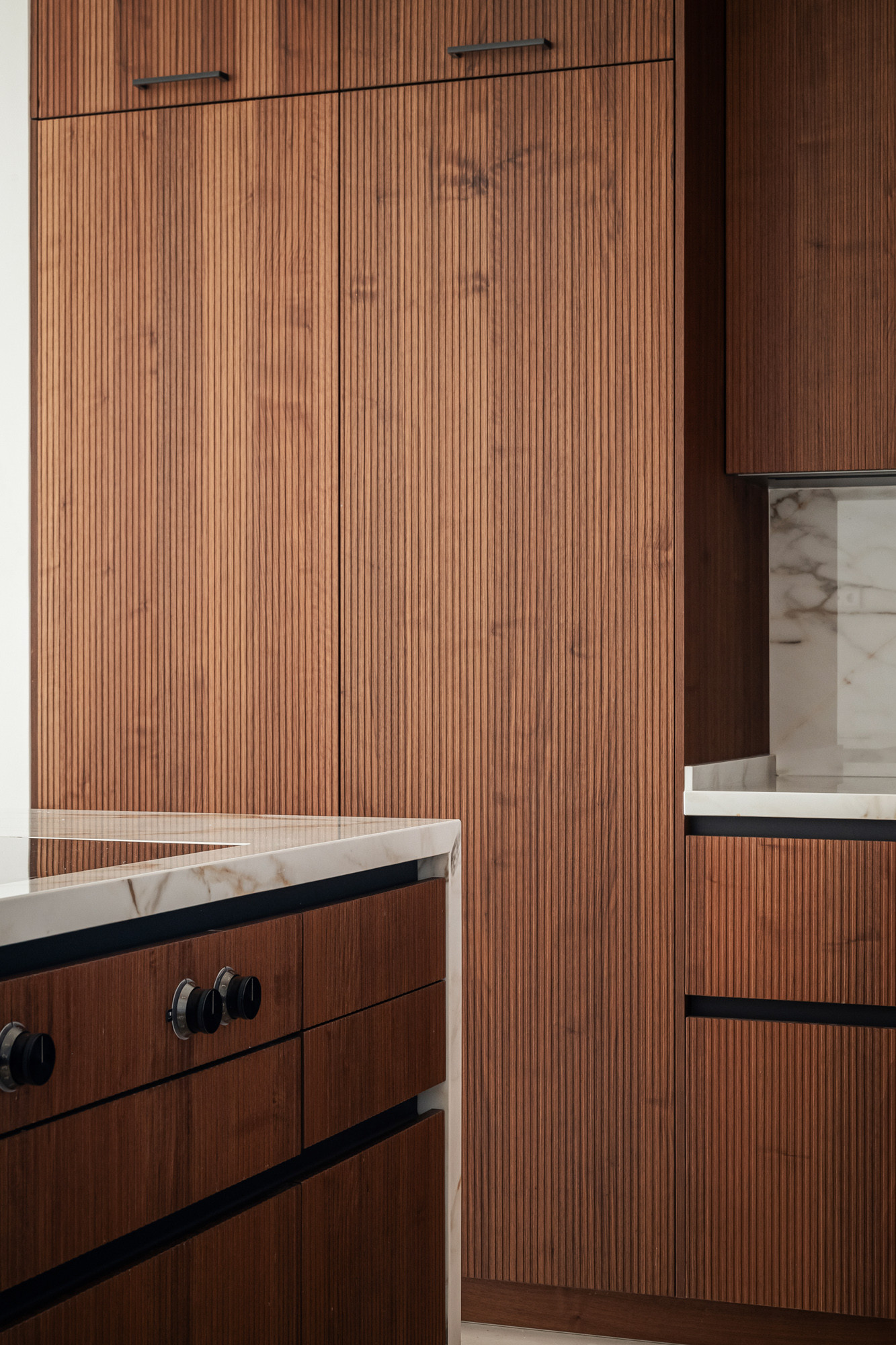 Un hall central divide la distribución. En un lado, las zonas sociales: una cocina de planta abierta con electrodomésticos Gaggenau y Miele, expositor de vinos de suelo a techo y ventanas automatizadas que se abren por completo para fusionar interior y exterior. Una terraza en forma de L envuelve el espacio con vistas al mar, zona de estar, comedor, jacuzzi, ducha exterior y cocina de verano—rodeada de zonas verdes ajardinadas que aportan la atmósfera de una villa privada.