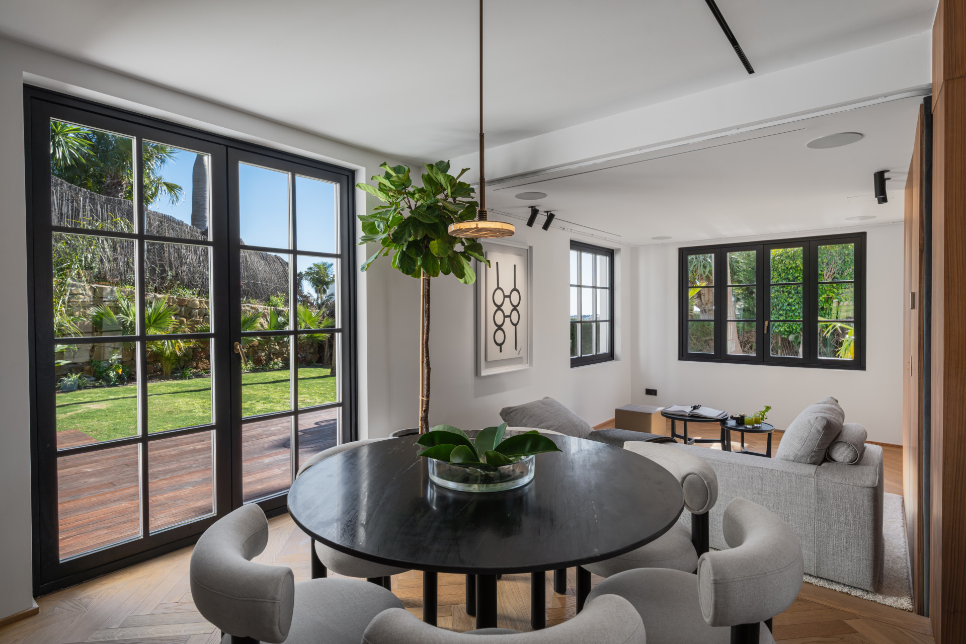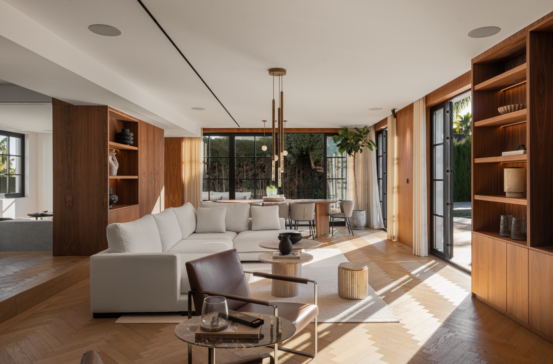 La zona principal de estar se conecta directamente con el nivel del jardín, donde la piscina, la zona de solárium y la cocina exterior integrada se convierten en una prolongación natural del interior. La cocina y el comedor se abren al exterior sin interrupciones, ofreciendo una distribución ideal tanto para el día a día como para recibir invitados. Las terrazas exteriores son amplias y privadas, enmarcadas por vegetación consolidada y orientadas hacia el campo de golf.