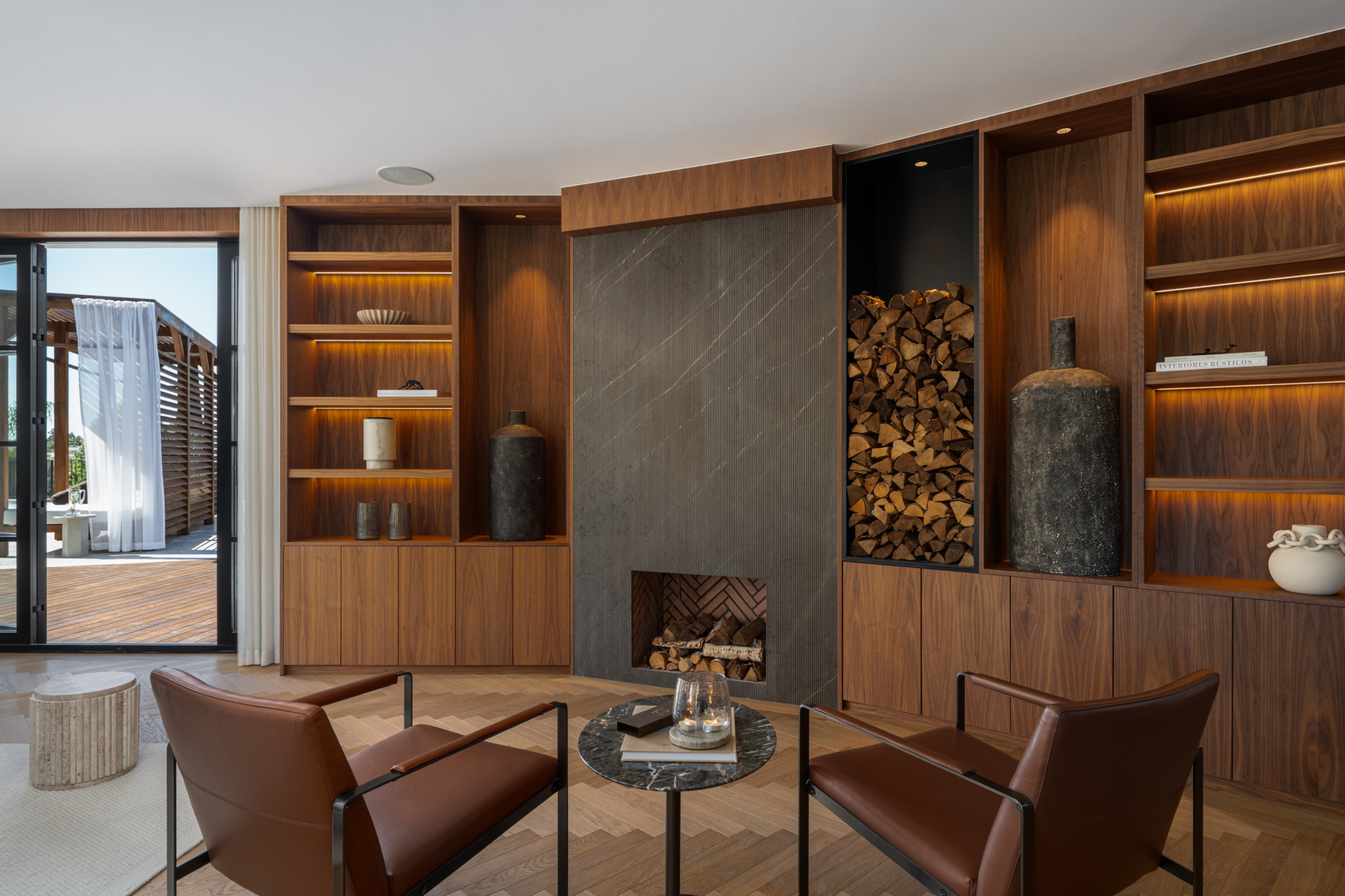 Elementos prácticos como un lavadero independiente, almacenamiento de vino integrado, carpintería a medida e iluminación en capas se integran discretamente en toda la vivienda.