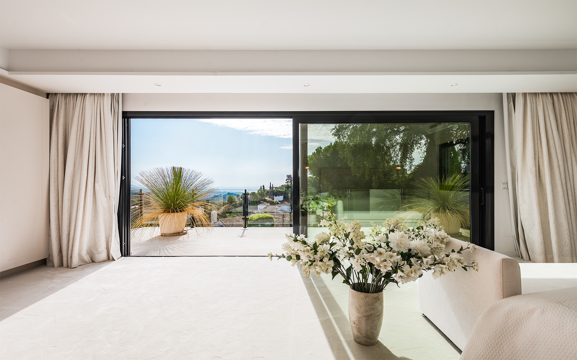 De bovenverdieping is volledig gewijd aan de master suite, die beschikt over een lichte slaapkamer, een badkamer met ligbad en douche, een inloopkast en een privéterras met prachtig uitzicht.
