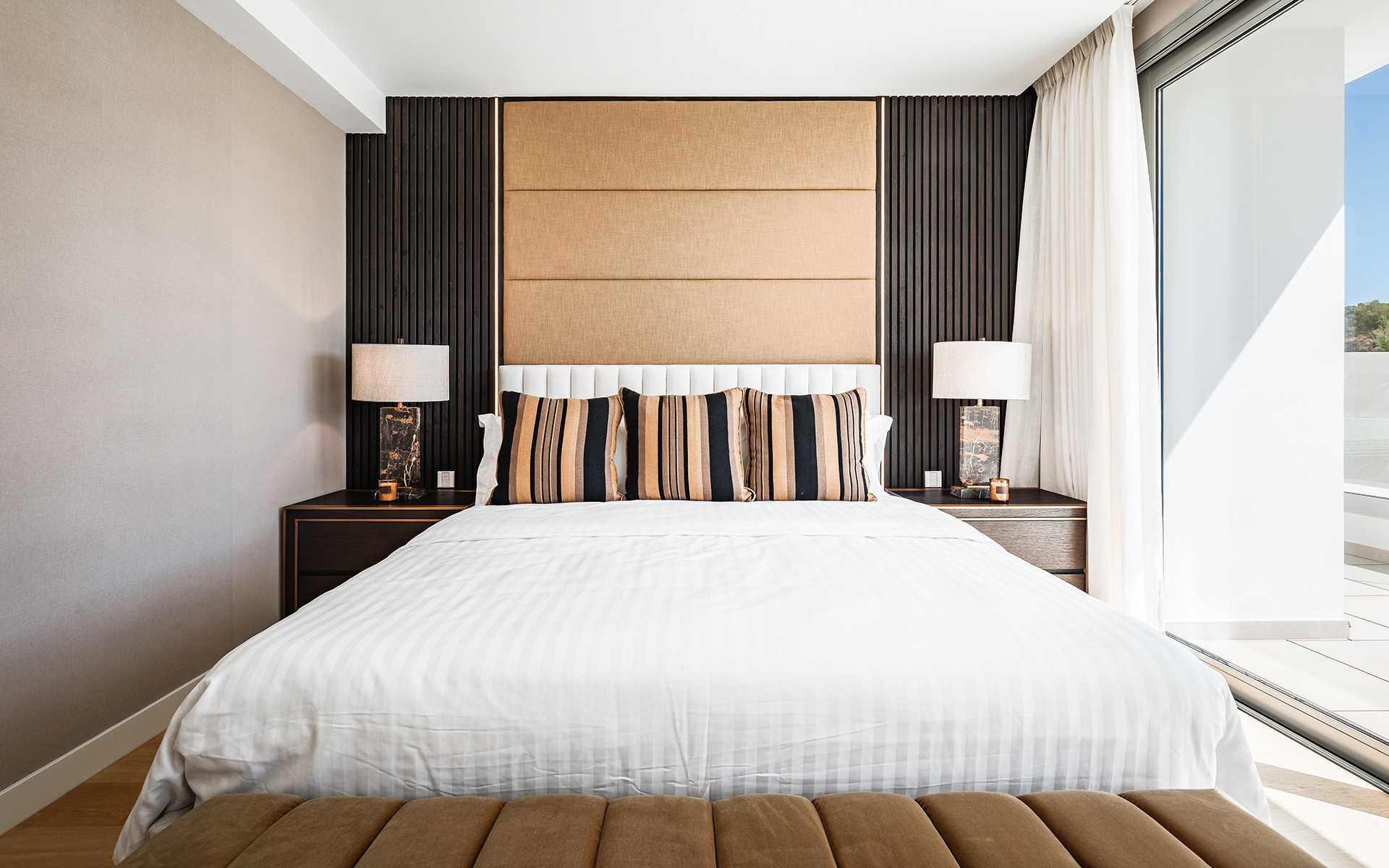 De villa beschikt over vijf royaal bemeten slaapkamers, allemaal met en-suite badkamers, en daarnaast een gastentoilet. De interieurs zijn afgewerkt met natuurlijke houten vloeren, vloerverwarming en elektrische rolluiken, wat zorgt voor een perfecte balans tussen stijl en functionaliteit.