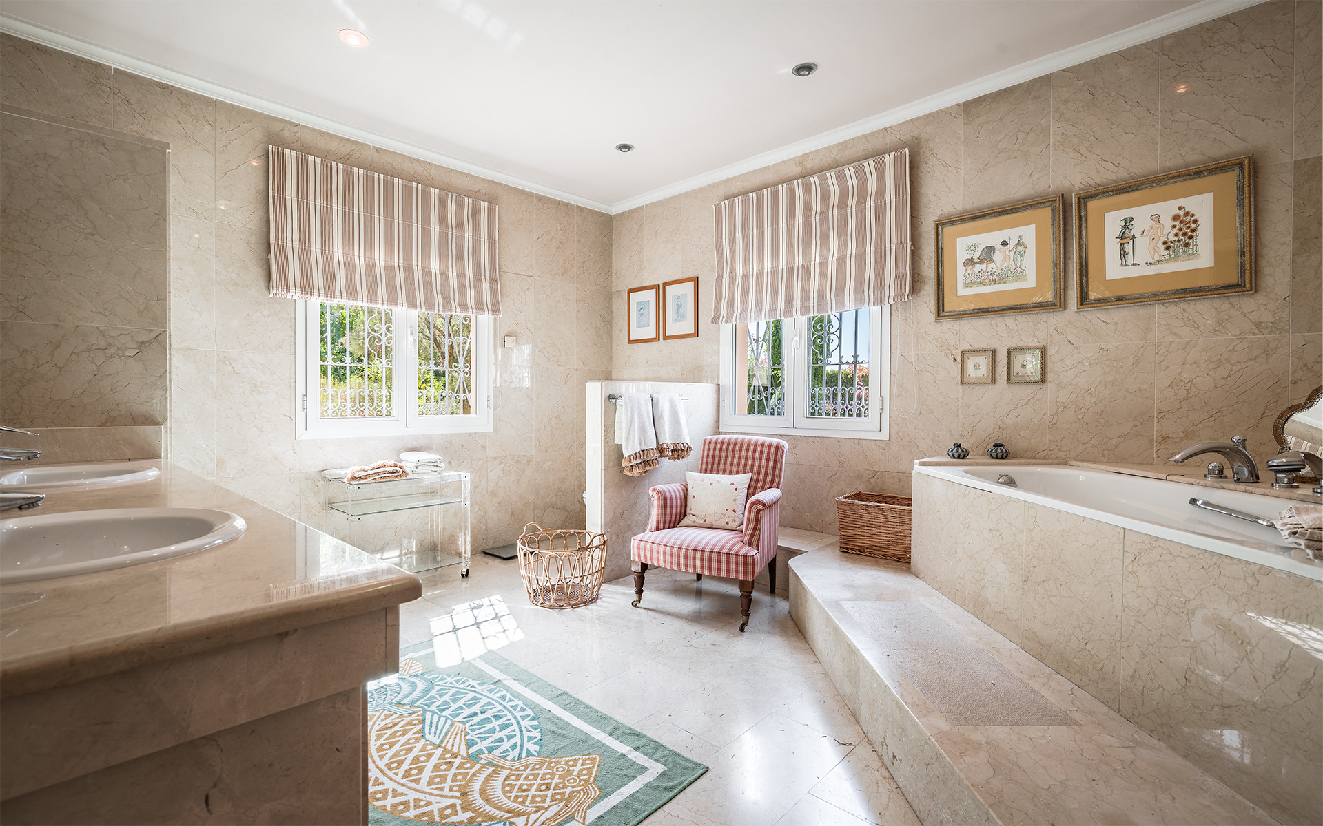 Een schilderachtige Andalusische binnenplaats met een centrale fontein verwelkomt u in het huis, het creëren van een warme en uitnodigende sfeer vanaf het moment dat u aankomt. Binnen opent de villa zich in een uitgestrekte woonkamer met hoge gevelplafonds, bedachtzaam verdeeld in verschillende omgevingsruimten een gezellige lounge met een open haard, een formele eetkamer, en een heerlijke muziek of leeshoek verankerd door een piano.