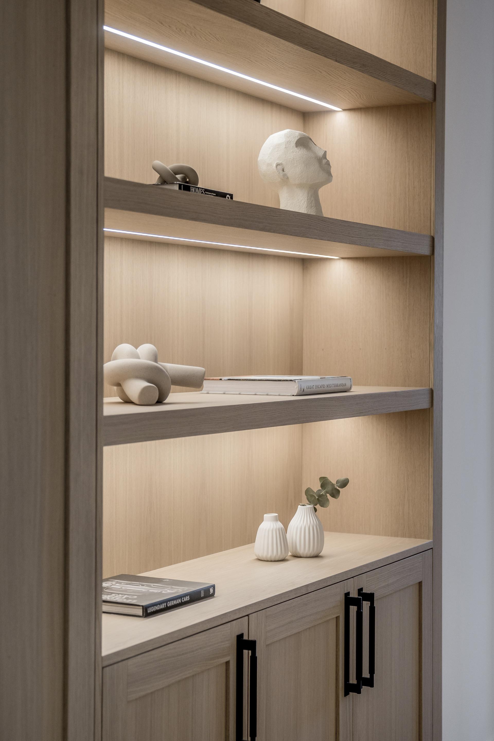 wooden accents, bespoke wardrobes, and flattering LED lighting