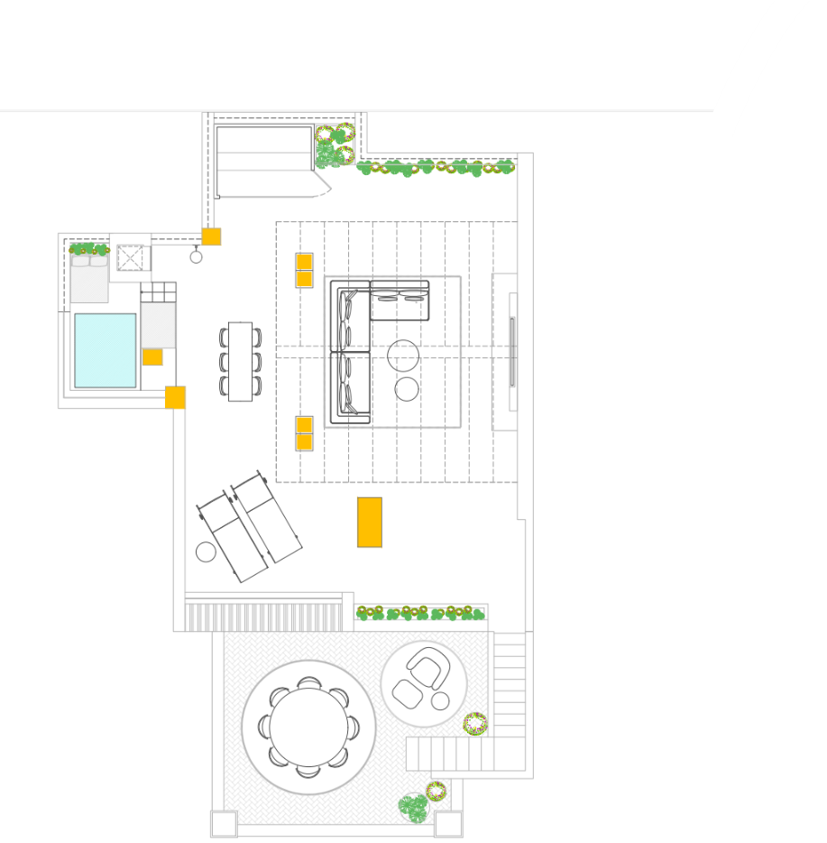 The large rooftop terrace offers stunning views of the Mediterranean Sea and features spaces carefully designed to eat outdoors, enjoy well-being and relax in total comfort.