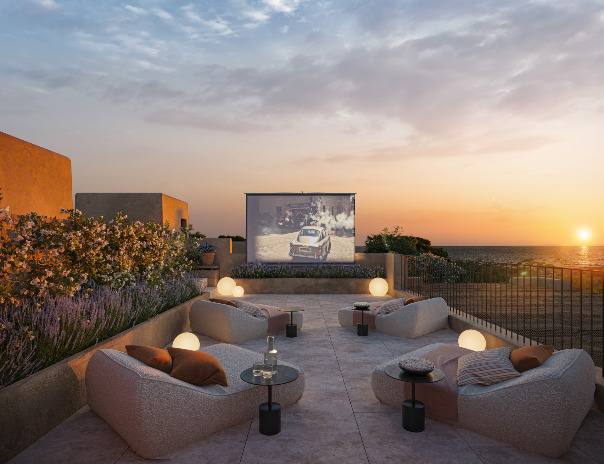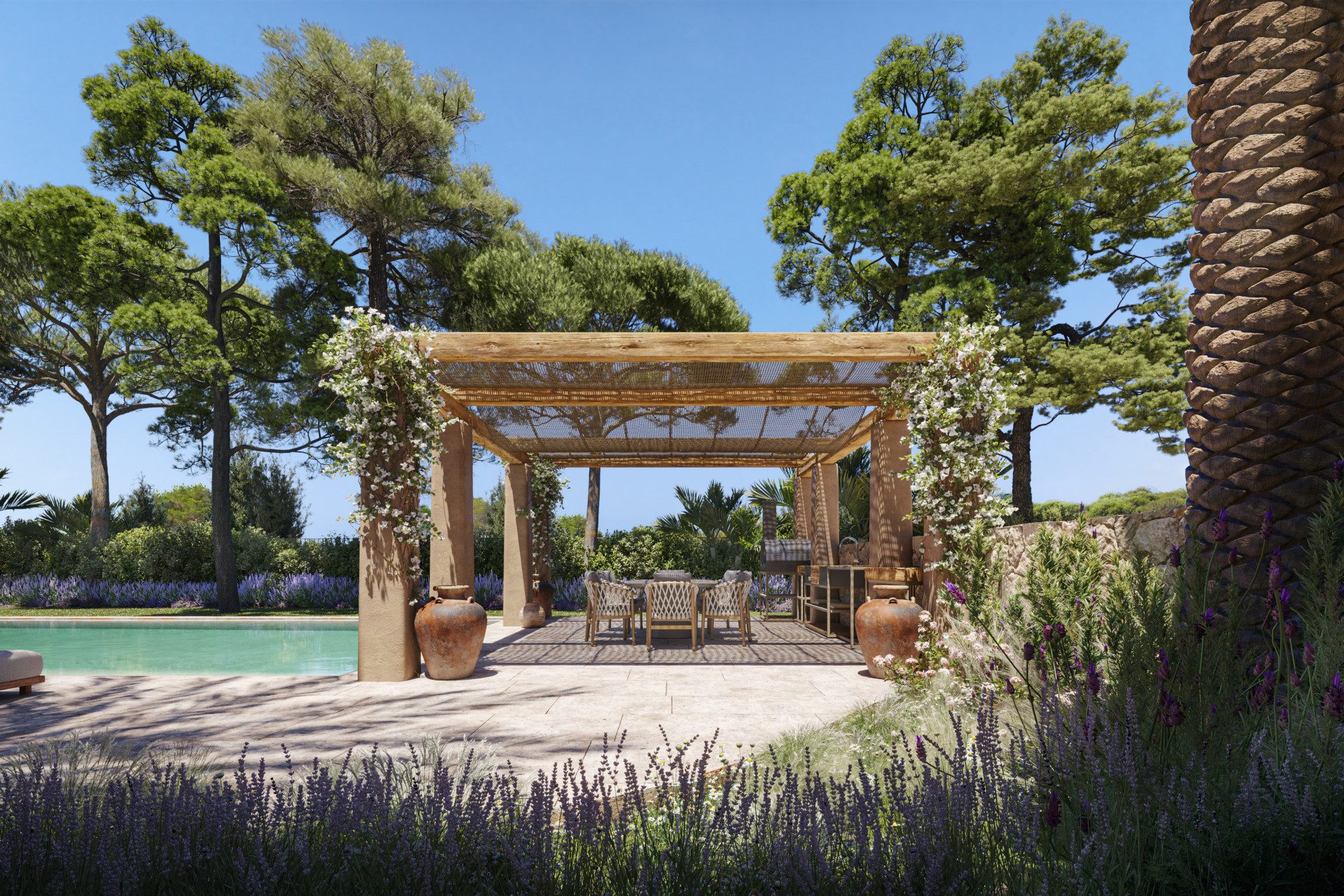 The outdoor areas of Villa Silencio are as impressive as the interiors. The villa features multiple terraces, including a stunning roof terrace with panoramic sea views, ideal for sunset cocktails or stargazing on warm Ibiza nights. The meticulously landscaped gardens are a serene oasis, featuring a variety of Mediterranean plants and trees that enhance the natural beauty of the surroundings.