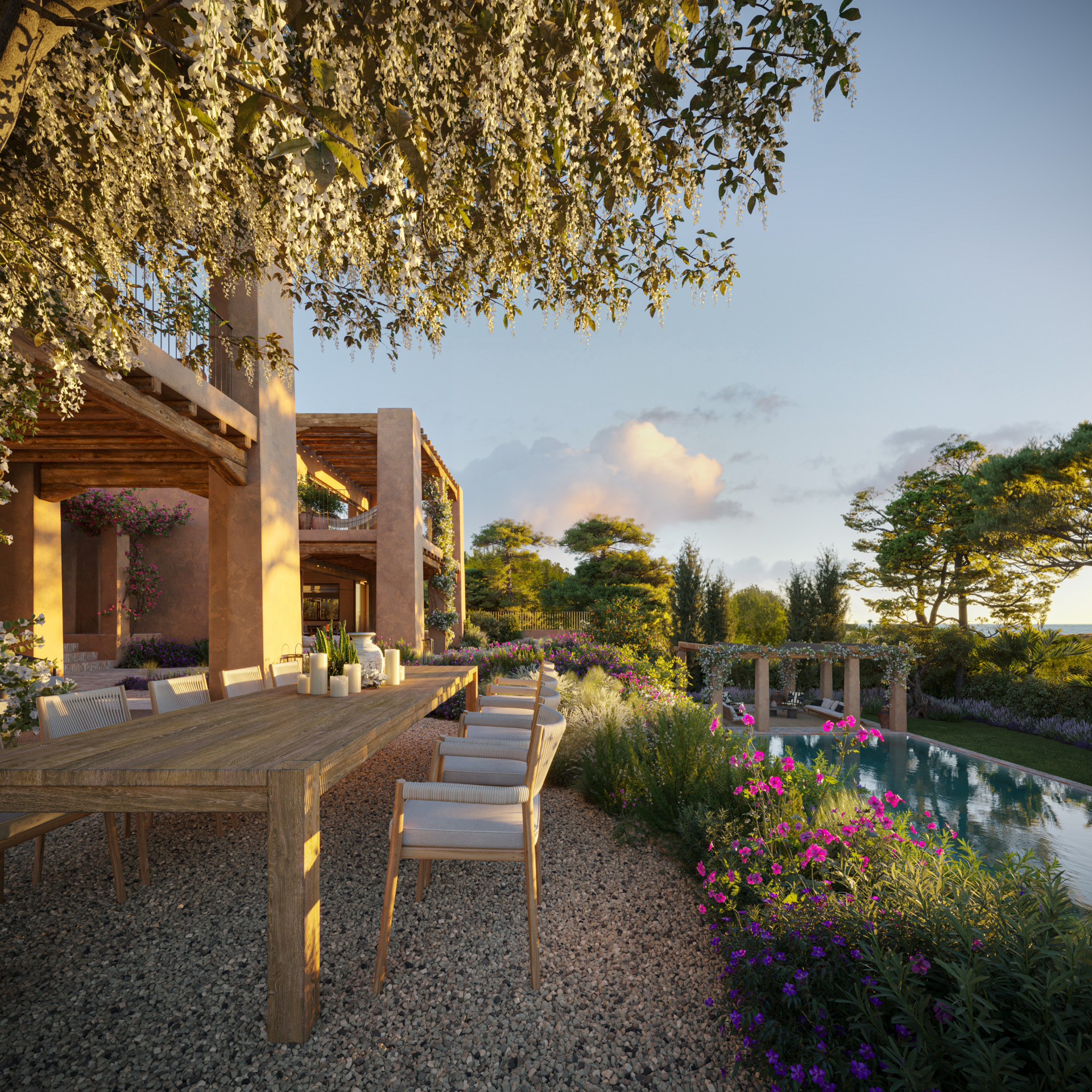 The interior of Villa Silencio is a testament to refined elegance and timeless design. The villa features six spacious bedrooms, each with its own en-suite bathroom, offering privacy and comfort for family and guests alike. The master suite is a sanctuary of its own, with expansive views and direct access to the outdoor terraces.