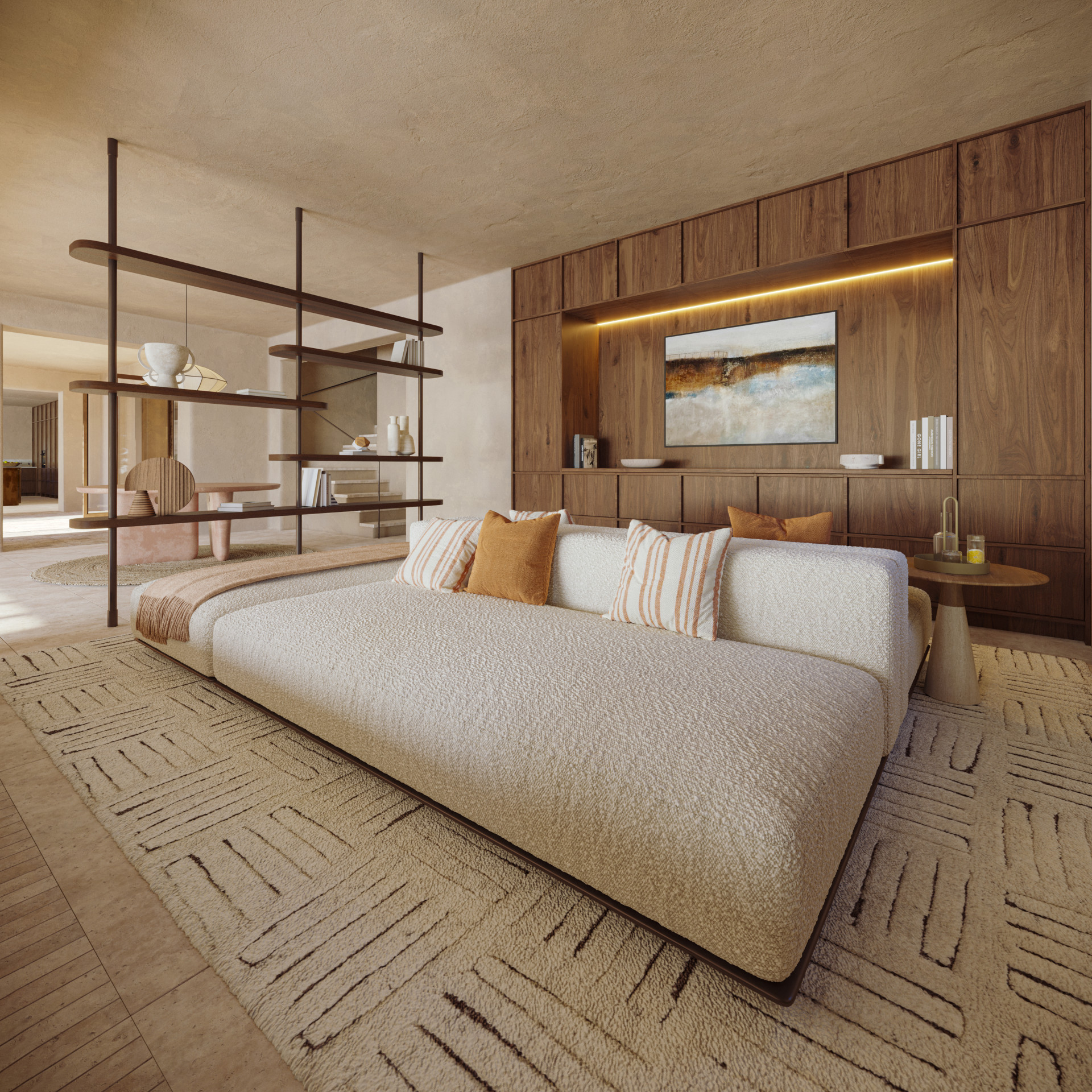The open-plan living areas are designed to enhance the flow of natural light, creating a bright and airy ambiance. The living room, with its high ceilings and large windows, provides a seamless connection to the outdoor spaces, allowing for a true indoor-outdoor living experience. The state-of-the-art kitchen is a chef’s dream, equipped with top-of-the-line appliances and ample counter space, perfect for both casual dining and entertaining.