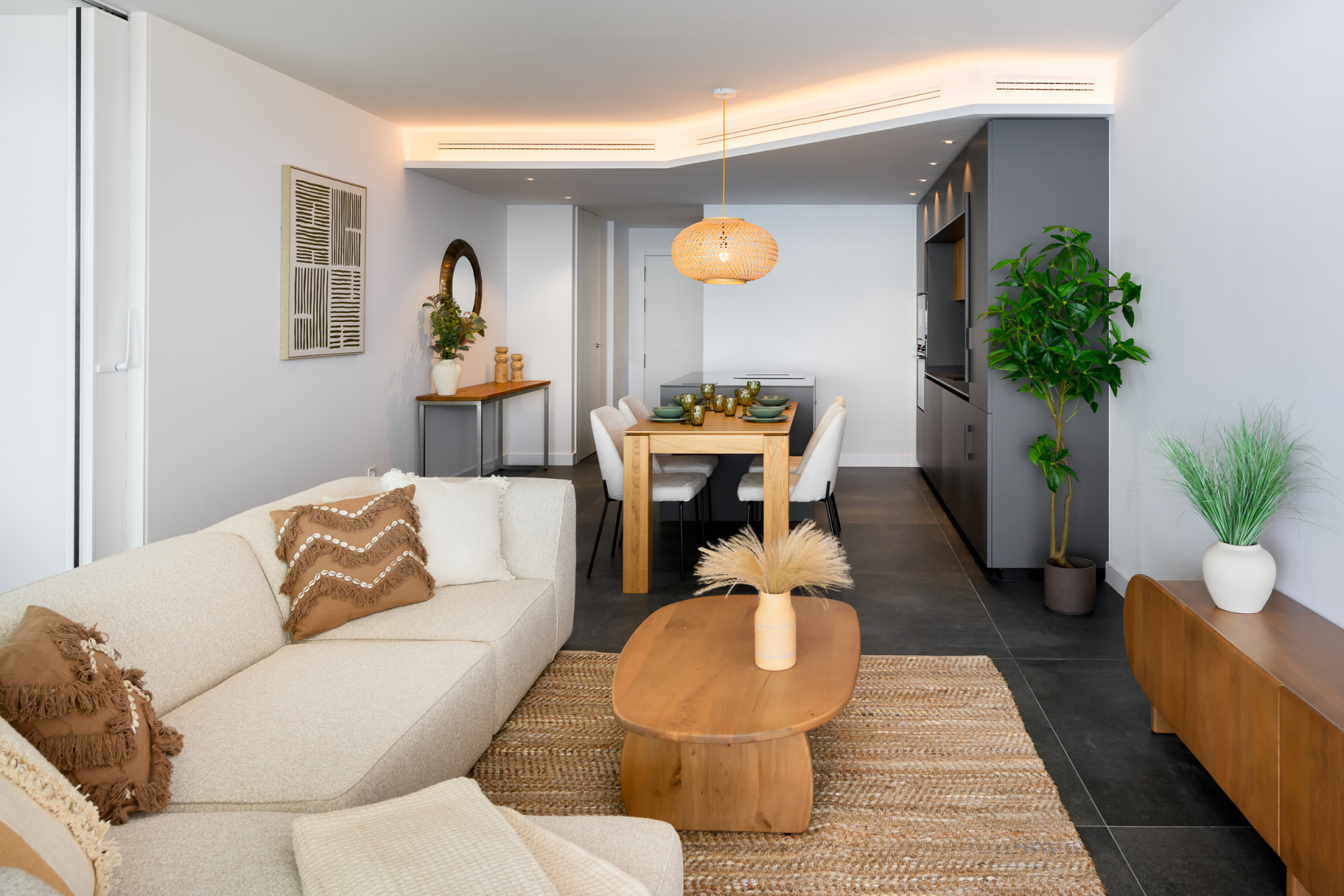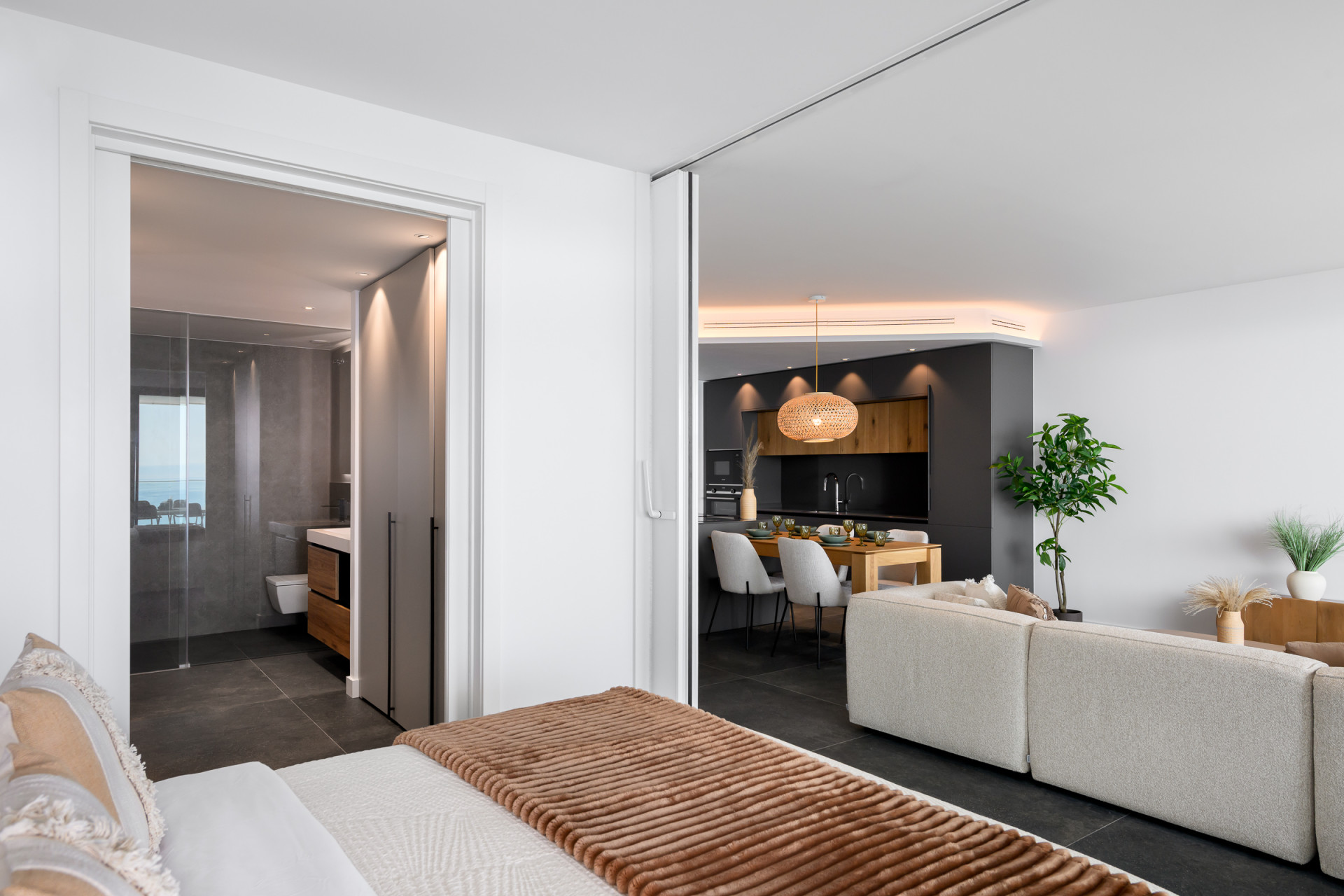 The apartment is designed around open-plan living, seamlessly integrating the kitchen, dining, and lounge areas into one elegant space filled with natural light. Floor-to-ceiling glass doors open directly onto an impressive 39m² private terrace, creating a true indoor-outdoor lifestyle with breathtaking views across the Mediterranean.