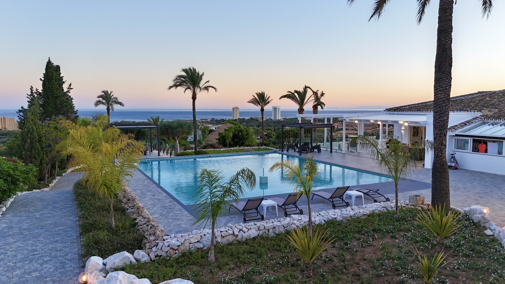 The villa’s lower pool level features a self-contained apartment with private access, offering three bedrooms, 2 bathrooms, and a shower, ideal for guests, extended family, or home office. Other features include solar panels with potential for expansion, underfloor heating, three garages, and a spacious driveway for up to five cars.