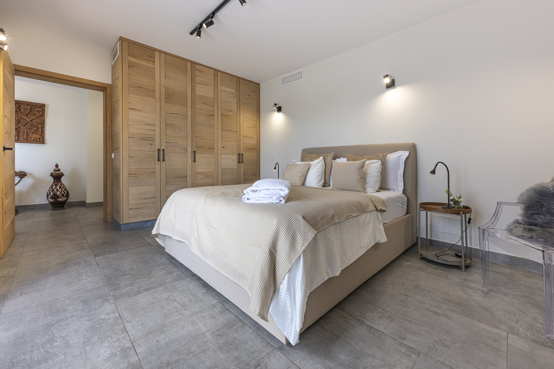 Inside, the villa feels bright, open and welcoming. The heart of the home is the spacious living room, designed with floor-to-ceiling glass doors that open directly onto the terrace, framing fantastic views of the sea and surrounding greenery. Natural light floods in from all angles, creating a warm and inviting atmosphere. The contemporary kitchen with breakfast area flows naturally into this space, making it ideal for family life and entertaining. There are four deluxe bedrooms, including a main suite with indoor and outdoor showers.