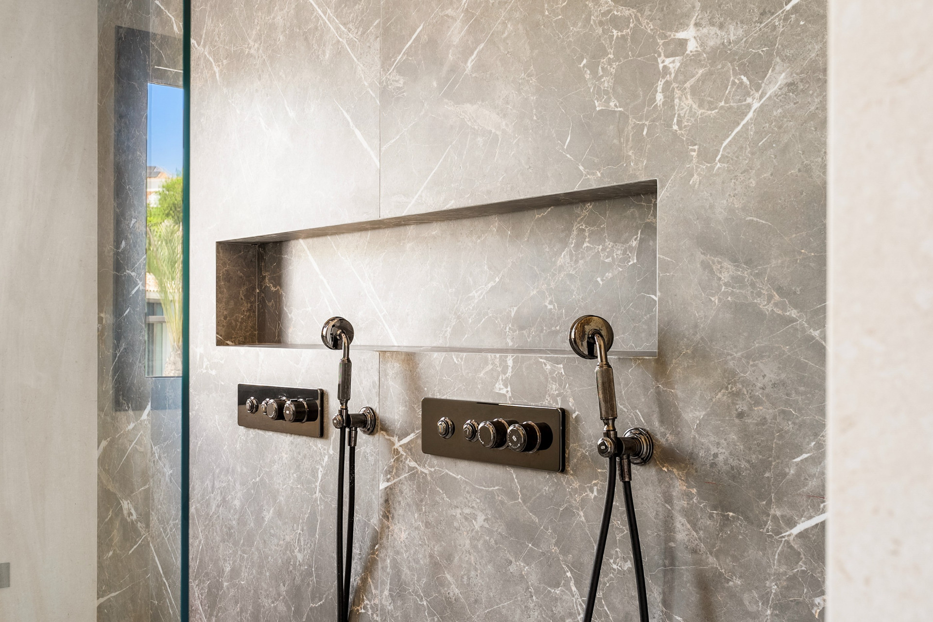 Spread across three levels connected by a lift, the layout combines generous scale, smooth flow, and everyday comfort. The main level seamlessly connects the living and dining areas to a fully fitted Gaggenau kitchen with custom Italian cabinetry. Six en-suite bedrooms are distributed throughout the house, together with a large office that can easily be adapted as a seventh bedroom.