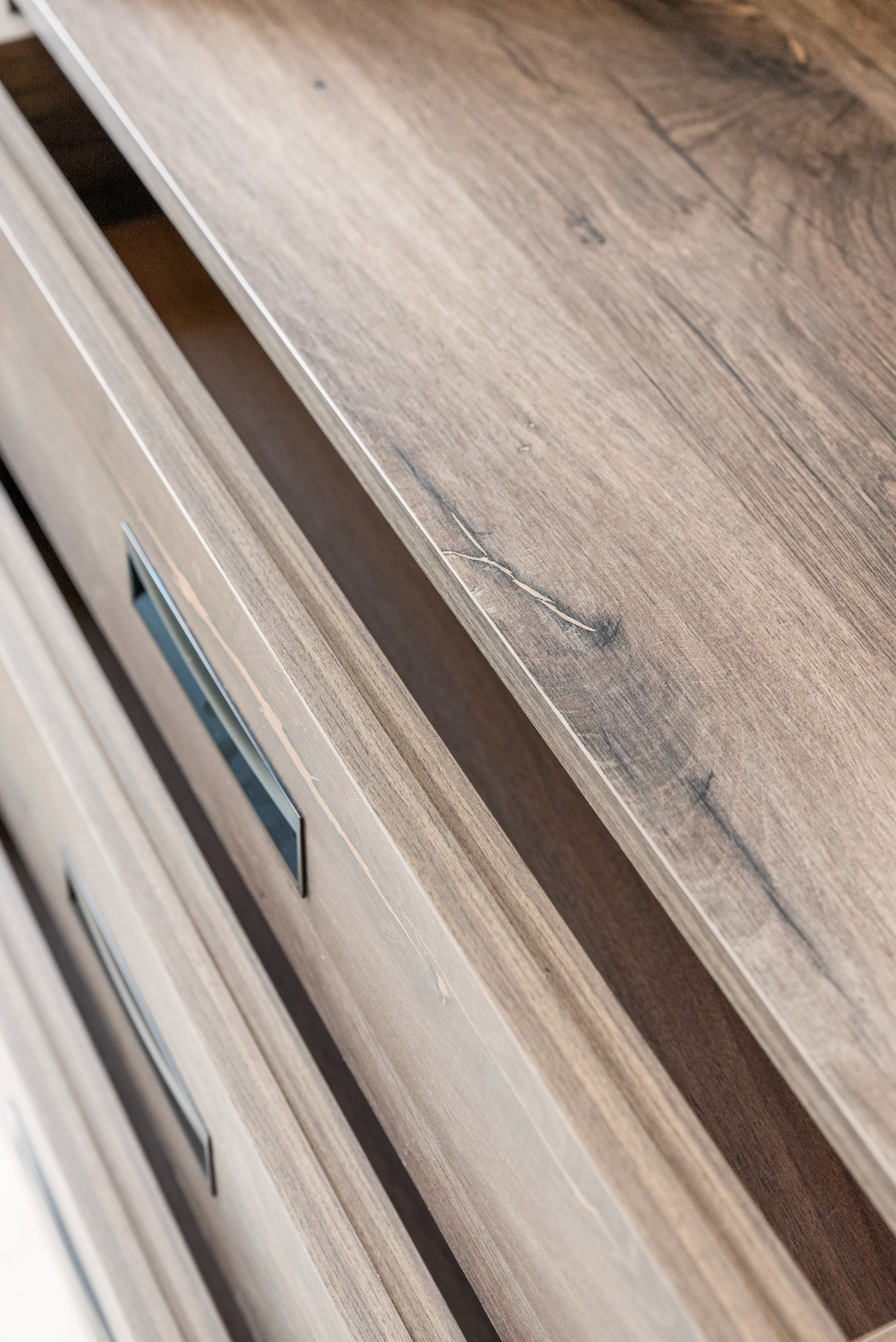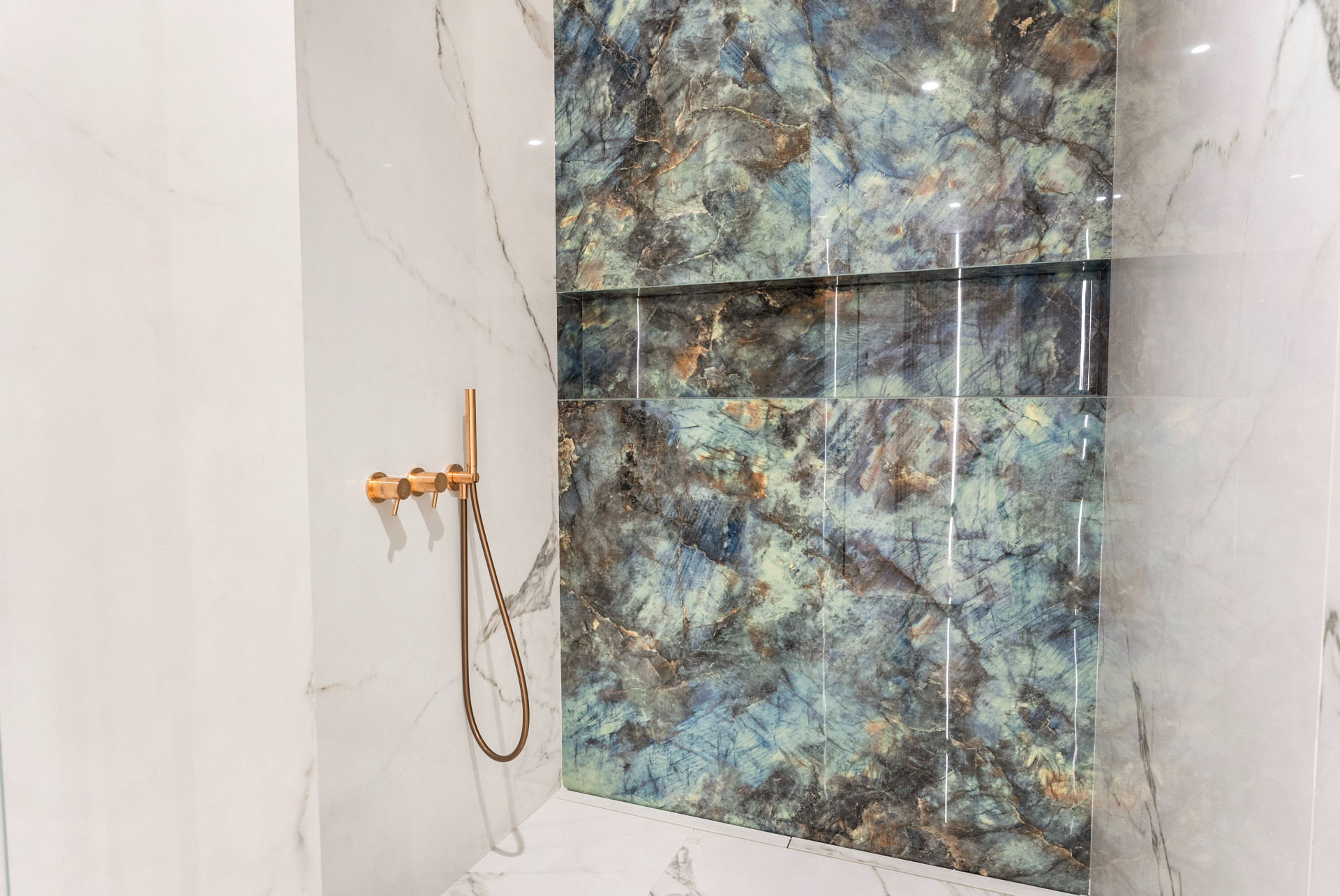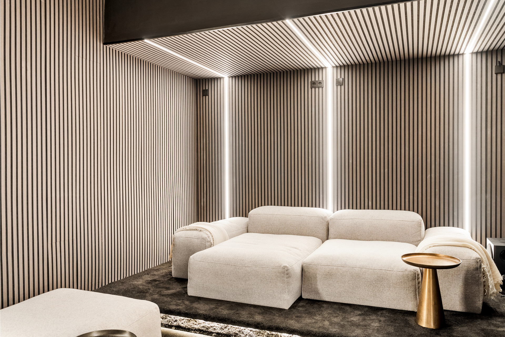 The lower floor is designed for leisure and relaxation, featuring a second lounge with a kitchenette, a cinema room, a fully equipped gym with steam room and shower, and a laundry area. Bathrooms are finished with Gessi fittings and Italian large-format porcelain tiles, reflecting a refined sense of quality and craftsmanship.