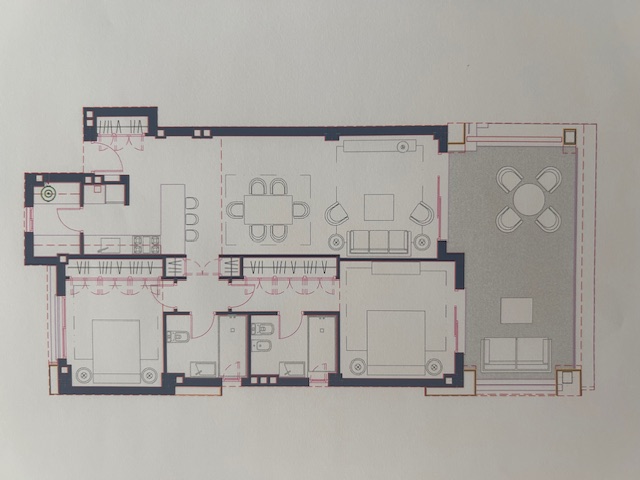 Built in 2021, the penthouse offers a practical and modern distribution. The entrance hall leads to a spacious living-dining room connected to an open kitchen fully equipped with high-quality appliances and a separate laundry room. The master bedroom has an en-suite bathroom and large built-in wardrobes, while the second guest bedroom has an independent bathroom. Both the living room and the master bedroom have direct access to a large partially covered terrace, ideal for relaxing, enjoying outdoor meals, or entertaining guests.
